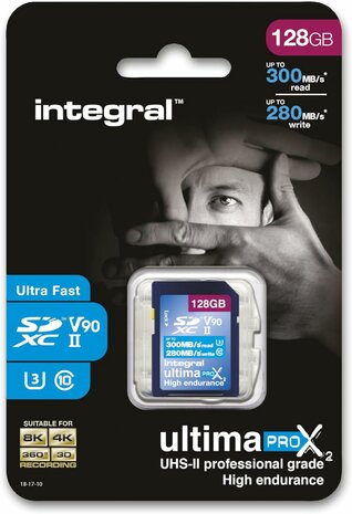 This 128GB SDXC memory card from Integral is made for demanding photographers! Whether you take photos all day long, take many photos per second or whether you want to film in the highest resolution, it is all possible with this memory card.
