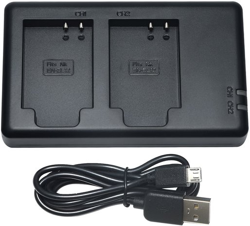 EN-EL12 USB dual charger produced by DSTE for Nikon. It enables you to charge your camera battery wherever you go, for example in your car. A red indicator light indicates that the battery is being charged, a green light indicates that the battery is fully charged.