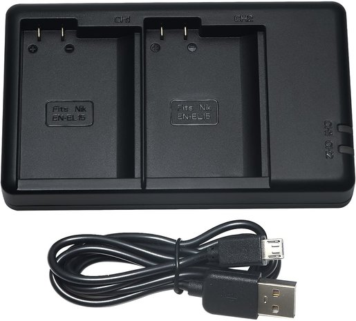 EN-EL15A USB dual charger produced by DSTE for Nikon. It enables you to charge your camera battery wherever you go, for example in your car. A red indicator light indicates that the battery is being charged, a green light indicates that the battery is fully charged.