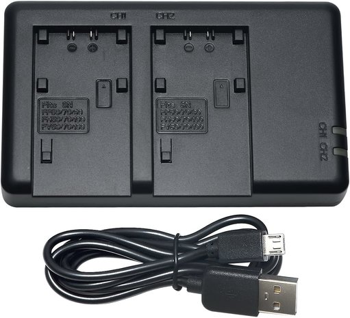 NP-FV70 USB dual charger produced by DSTE for Sony. It enables you to charge your camera battery wherever you go, for example in your car. A red indicator light indicates that the battery is being charged, a green light indicates that the battery is fully charged.